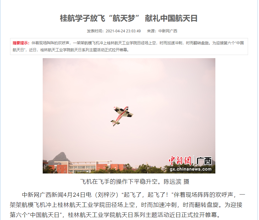 据悉,围绕今年“扬帆起航 逐梦九天”的中国航天日活动主题,桂林航院邀请空军特级飞行专家张信民为在校师生做学术报告,激发广大学子献身航空航天事业,不断攀登新的科学高峰的热情。该校志愿者更走进中小学校园开展“蓝天课堂”航空航天科普体验活动,让孩子们零距离感受航空魅力。通过开展系列各具特色、精彩纷呈的主题活动,号召社会各界在新时代再启新征程,追逐梦想,勇于探索,争做新时代追梦人,加快推动航天事业发展,为航天强国建设贡献更多智慧和力量。