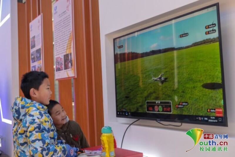 图为小学的学生体验模拟飞行。中国青年网通讯员 罗聘宇 摄