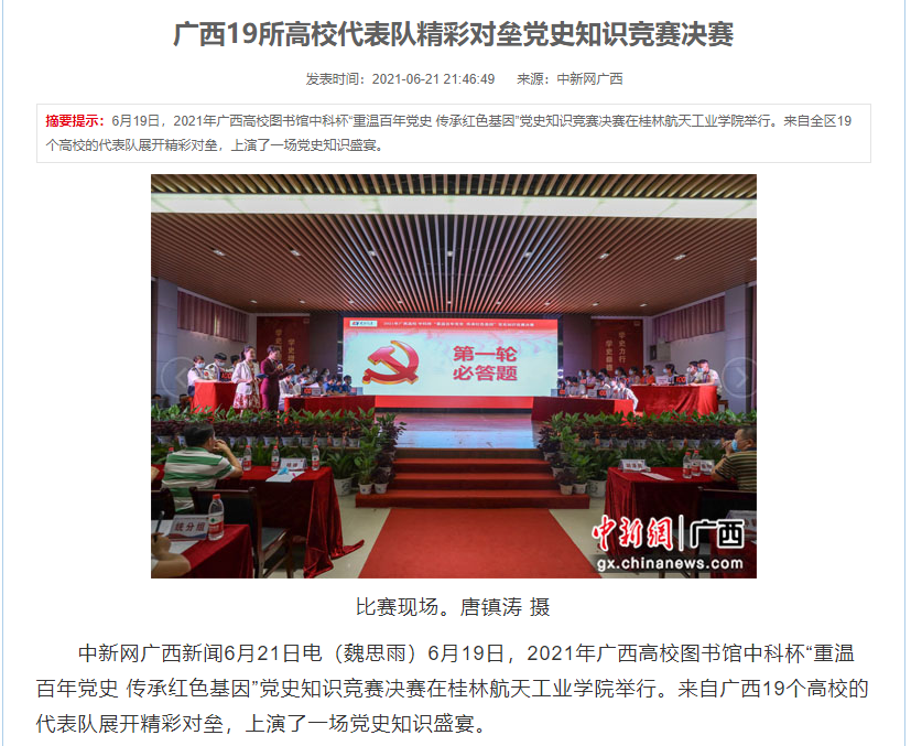 中新网广西新闻6月21日电(魏思雨)6月19日,2021年广西高校图书馆中科杯“重温百年党史 传承红色基因”党史知识竞赛决赛在best365手机版官方网站举行。来自广西19个高校的代表队展开精彩对垒,上演了一场党史知识盛宴。