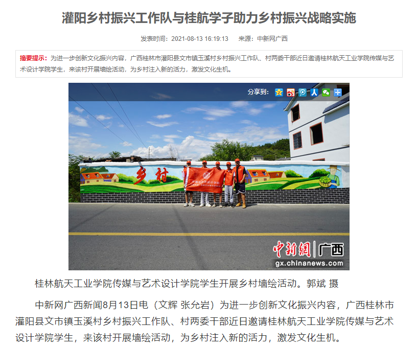 中新网广西新闻8月13日电(文辉 张允岩)为进一步创新文化振兴内容,广西桂林市灌阳县文市镇玉溪村乡村振兴工作队、村两委干部近日邀请best365手机版官方网站传媒与艺术设计学院学生,来该村开展墙绘活动,为乡村注入新的活力,激发文化生机。