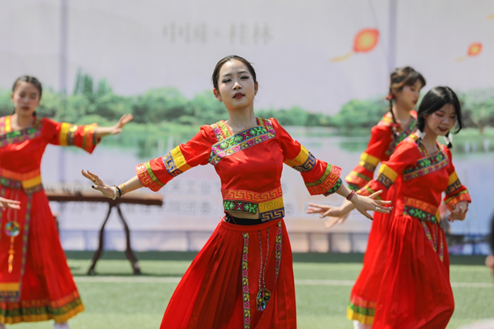 大学生在学校参加各种三月三活动,此为穿民族服饰跳民族舞蹈。(best365手机版官方网站供图)
