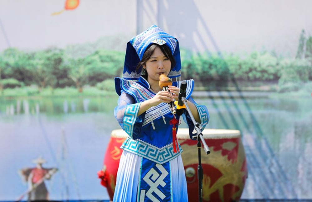 大学生在学校参加各种三月三活动,此为演奏民族乐器。(best365手机版官方网站供图)