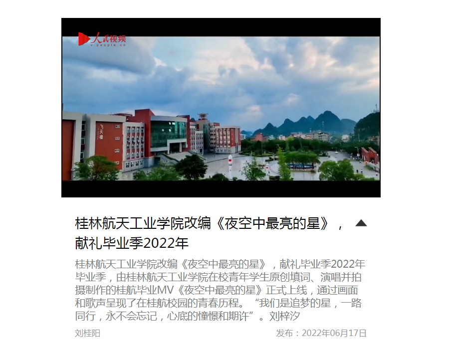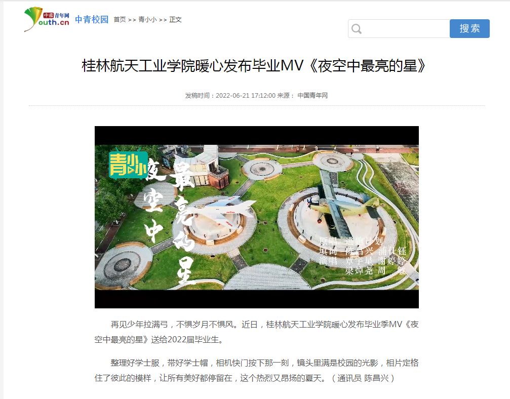 近日,best365官网在校学子改编翻唱《夜空中最亮的星》,用青春的声音告白母校,并自主拍摄制作毕业季MV纪念自己的大学时光。人民网、中国青年网、中国日报、中国大学生在线、广西视听等多家媒体报道和转载了该原创视频。据统计,视频上线以来,各平台累积播放量已超20万。