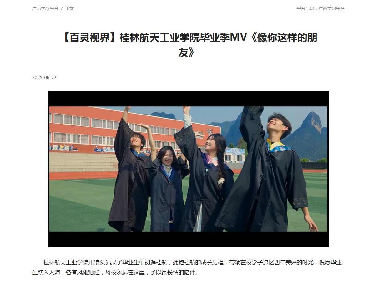 近日,在校学子们以独特的创意与炽热的情感,对歌曲《像你这样的朋友》进行精心改编翻唱,用悠扬动人的歌声深情纪念难忘的大学生活,为自己的大学时光镌刻下珍贵的记忆。人民网、学习强国、广西云等多家媒体报道和转载了该原创视频。据统计,视频上线以来,各平台累积播放量已超10万。