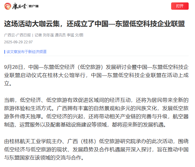 9月28日,中国—东盟低空经济(低空旅游)发展研讨会暨中国—东盟低空科技企业联盟启动仪式在桂林大公馆举行,中国—东盟低空科技企业联盟在活动上成立。