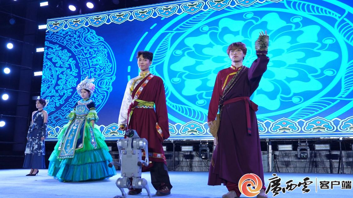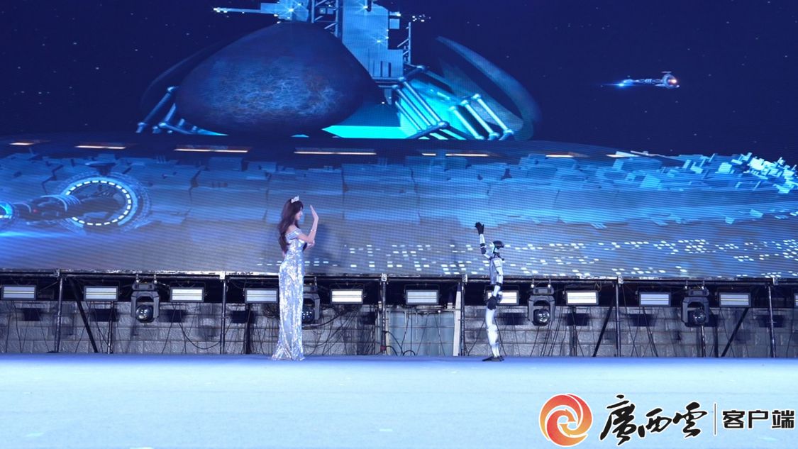 科技赋彩,绘就空天画卷。整场晚会以航空航天元素为主线,深度融合科技创新与艺术表达,打造出一系列极具航天特色的精彩节目。街舞《翼动节拍》将无人机飞行轨迹与街舞动作精准配合,展现青春节奏与科技灵动的完美融合;创意走秀《寰宇衣章》创新引入“机器人”与“机器狗”同台表演,在民族服饰中巧妙融入航天元素,同时展示了学校学生自主设计的科技作品,呈现了“科技+民族”的创意对话;情景舞蹈《你好,新同学》以独特的艺术语言,向2025级新生传递了美好的祝福。舞台上,国产C919飞机模型凌空而起,寓意着全体新生大学生活的全新启航。
