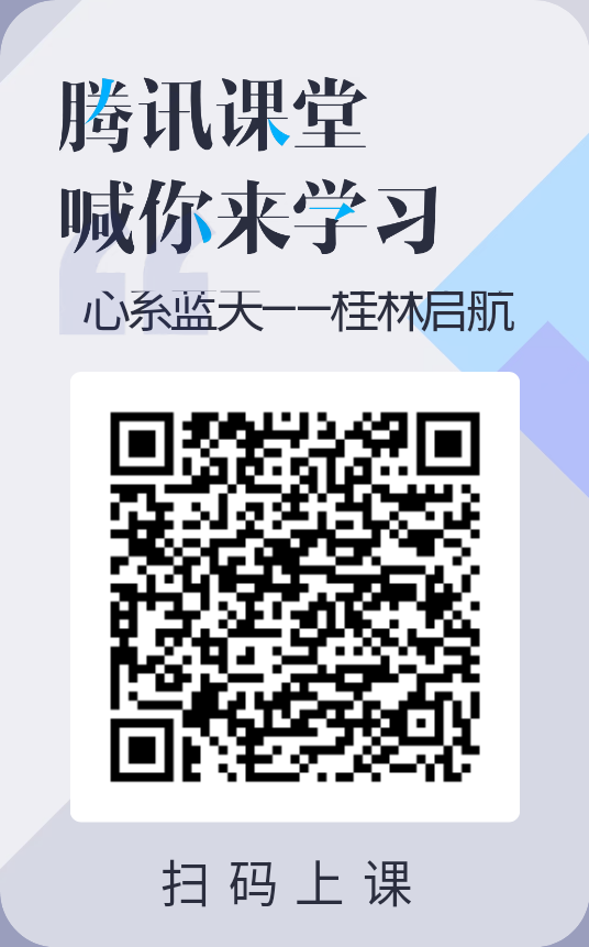 上课方式:本次系列讲座在腾讯课堂开展,请大家届时使用QQ扫描相应的二维码,在腾讯课堂APP进行听课。讲座计入桂航大讲坛听课次数(一期记为一次),请大家在登录腾讯课堂APP时输入“学号+姓名”作为用户名,以便于统计。