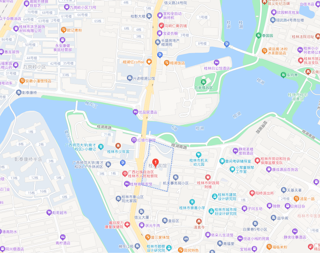 酒店出门即两江四湖(榕湖),可步行湖边游览;约1.1公里至两江四湖日月湾码头乘船游览;