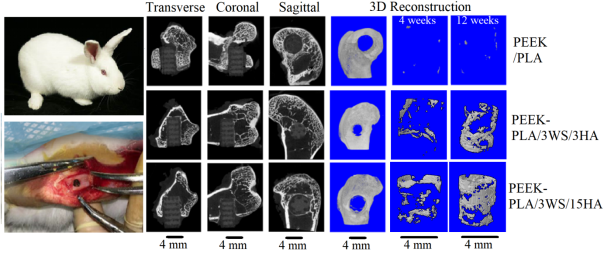研究了PEEK/PLA多孔骨骼支架的成型,分析了界面融合机理,揭示了FDM工艺、梯度孔隙结构和材料配比对力学和生物性能的影响规律。结果表明,PLA填充PEEK多孔支架的孔隙,将孔隙率为31.9%和58.7%的PEEK支架的拉伸强度分别由34.74 MPa和18.47 MPa提高到82.3 MPa和44.89 MPa;兔子体内实验表明,支架力学稳定性较好,PEEK-PLA/WS/HA支架的细胞增殖明显(图3)。