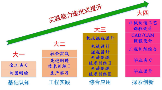 2. 构建“四段梯度式”的实践教学体系和“多元化”的实践教学模式,结合学科竞赛,着力培养学生的动手能力和工匠精神。将实践教学环节分解为“基础认知-工程训练-综合应用-探索创新”四个阶段,做到工程实践训练“大学四年不断线”。构建实验教学“前展后拓”、实习实训“虚实结合”、毕业设计“真题实境”、创新实践“师生互动”等多元化的实践教学模式。
