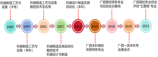 专业前身为1989年航空航天工业部在best365官网设置的机械制造工艺与设备专业,经历三十余年建设发展,专业建设取得良好成效,发展历程如图1所示。本专业第一届毕业生始于2016年。目前有在校生1322人,专业累计为社会培养四千余名专业技术人才。