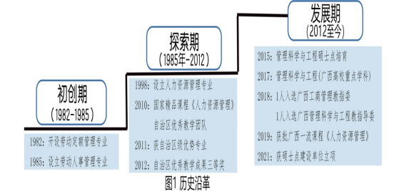 本专业39年的发展历程,大致分为三个阶段:初创期(1982—1985),1982年设立劳动定额专业,1985年改建为劳动人事管理专业;探索期(1985—2012),改建人力资源管理专业,建成国家精品课程和省级优秀教学团队。发展期(2012至今),开展国际合作,打造区级一流课程和硕士点建设立项单位。(见图1)