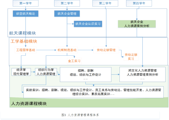 以新文科的教学理念为指引,管理学与工学相融合,发挥学校工科优势和航天行业资源,打造航天课程模块+工学基础课程模块+人力资源管理模块的人才培养体系。