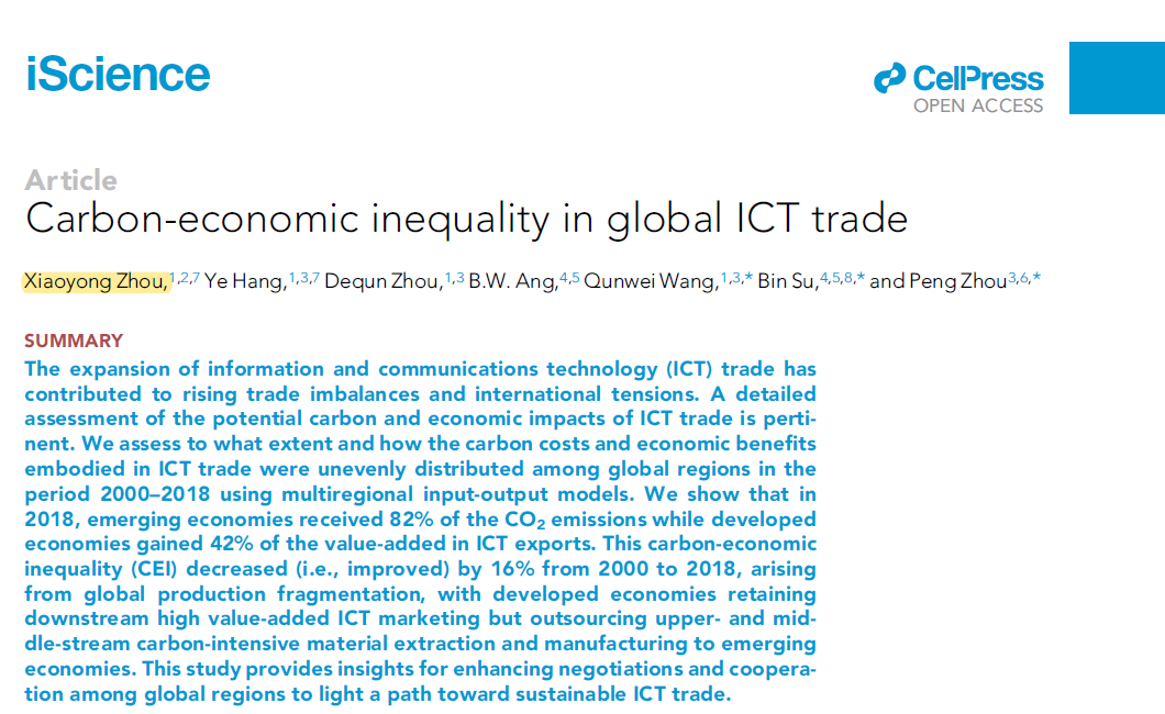近期,管理学院教师周小勇博士在Cell子刊iScience发表题为《Carbon-economic inequality in global ICT trade》的论文,标志着学院在能源环境管理领域取得较大进展。周小勇博士为论文第一作者,南京航空航天大学大学王群伟教授、新加坡国立大学的苏斌研究员、中国石油大学的周鹏教授为通讯作者,其他合作作者包括南京航空航天大学的周德群教授、杭叶博士和新加坡国立大学的B.W. Ang教授。
