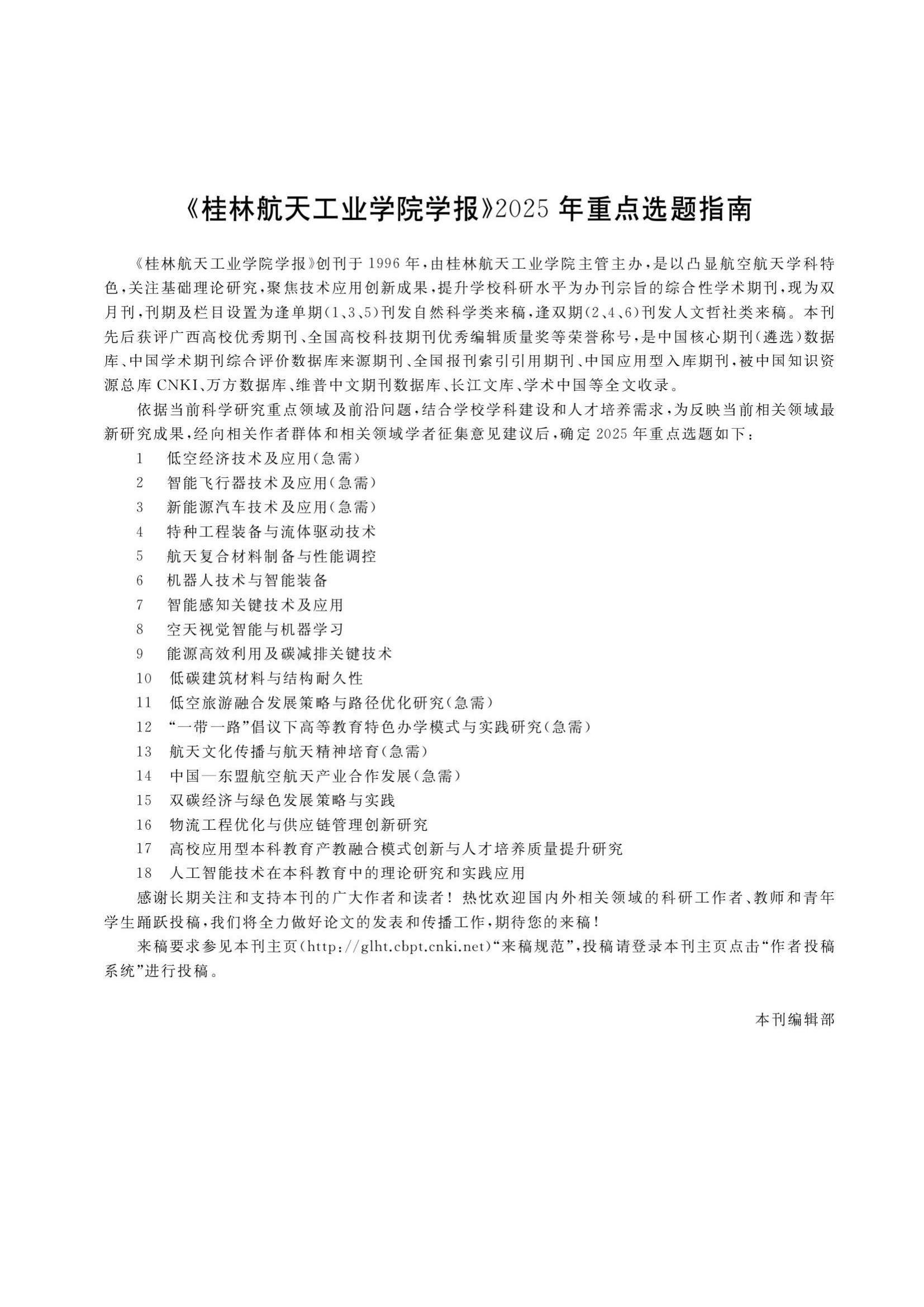 三、栏目创新:聚焦学术前沿与科研活力。新版学报在栏目设置上推陈出新,新增“青年编委专栏”,为青年学者搭建展示学术成果的平台,激发学术创新活力。同时,学报发布了2025年重点选题指南,并开设“人工智能+制造”专栏,聚焦前沿科技与产业融合。自然科学类栏目涵盖“航空航天研究”“工程技术与应用”等主题专栏,优先刊发创新性强、时效性高的应用性研究成果;人文哲社类栏目包括“航天文化研究”“低空经济研究”“人工智能+高等教育”等,注重学术深度与实践价值的结合。