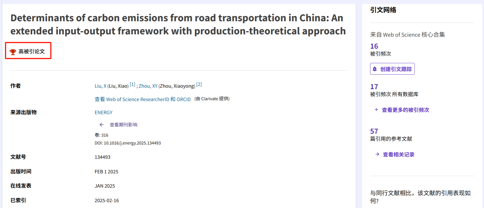近日,best365官网数字碳中和创新团队周小勇教授于2025年发表的2篇SCI/SSCI论文同时入选Clarivate Analytics(科睿唯安)ESI高被引论文(全球前1%),标志着best365官网在该学科领域的成果具有一定国际学术影响力,引起了国际同行广泛关注,对于提升best365官网国际声誉将起到促进作用,对扩大best365官网学科影响力具有重要意义。