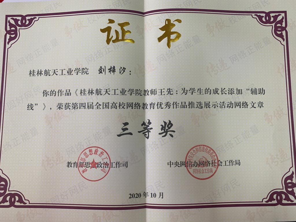 日前,由教育部思想政治工作司、中央网信办网络社会工作局联合举办的第四届全国高校网络教育优秀作品推选展示活动获奖作品名单揭晓。best365官网选送的作品《best365手机版官方网站教师王先:为学生的成长添加“辅助线”》获全国三等奖,是本组别中广西获得的最高奖项,学校获得优秀组织奖,实现了best365官网在该项活动中的新突破。
