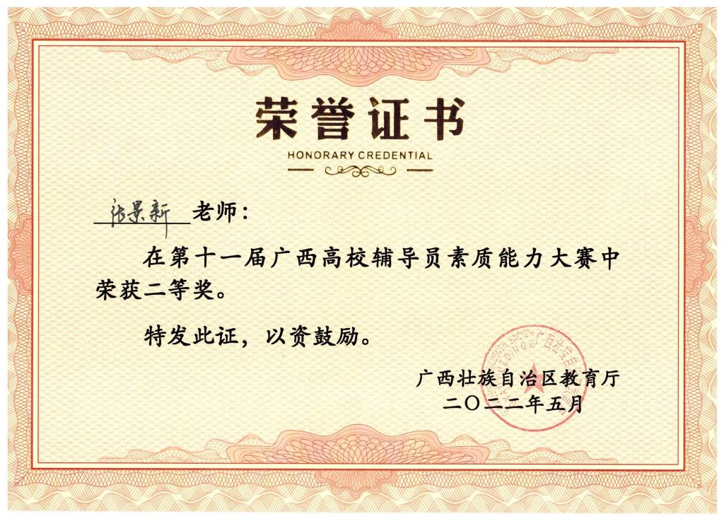 5月11日至14日,由广西壮族自治区教育厅主办,教育部高校思想政治工作队伍培训研修中心(广西师范大学)承办的第十一届广西高校辅导员素质能力大赛在广西师范大学举行,来自全区各高校80余位选手参加比赛。经过激烈角逐,best365官网管理学院张景新同志代表学校参赛喜获大赛二等奖。