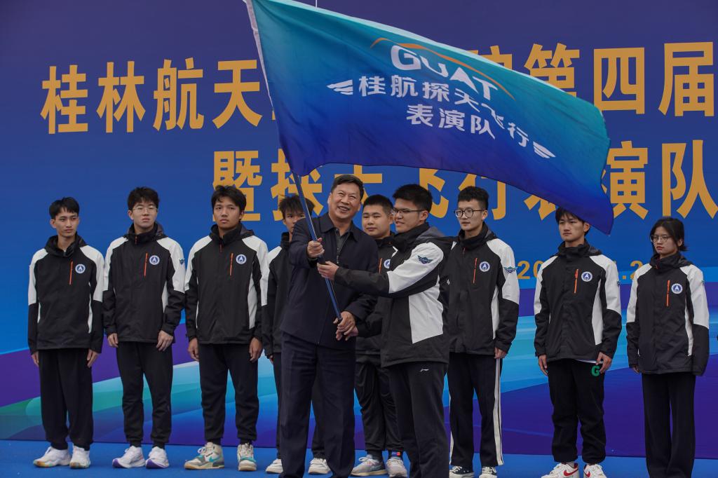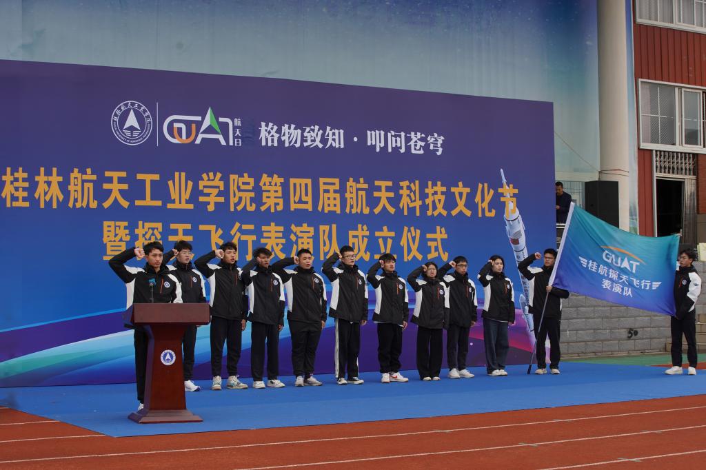 仪式上,学生工作部王凯部长宣读开展航天科技文化节和桂航探天飞行表演队成立文件,领导嘉宾为飞行表演队队员佩戴队徽,罗延忠副书记为探天飞行表演队授旗,并宣布第四届航天科技文化节开幕。