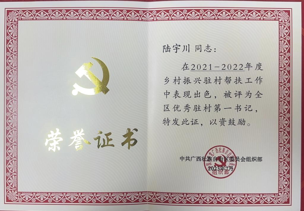 近日,自治区党委组织部印发了《关于表彰全区2021—2022年度驻村工作队先进集体和优秀个人的决定》(桂组发〔2023〕5号),对全区2021—2022年度10个乡村振兴驻村帮扶先进工作队、100个先进后盾单位、10名优秀县级工作队队长、199名优秀驻村第一书记以及300名优秀驻村工作队员进行了表彰。best365官网原派驻灌阳县新圩镇潮立村党组织第一书记陆宇川同志获得“全区优秀驻村第一书记”称号。