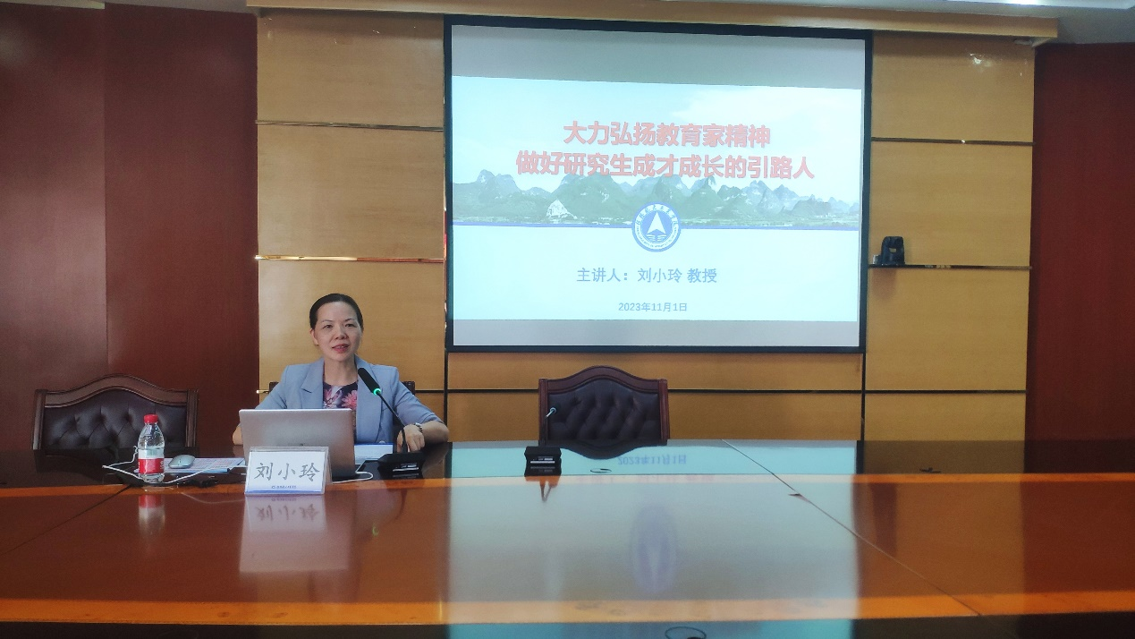 11月1日,广西大学副教务长、研究生院院长、教授、博士生导师刘小玲在飞天楼517会议室,为best365官网教师作了关于《大力弘扬教育家精神做好研究生成才成长的引路人》的专题报告。各教学单位行政工作主要负责人,硕士点召集人、硕士点方向负责人及教师代表出席并聆听了报告。