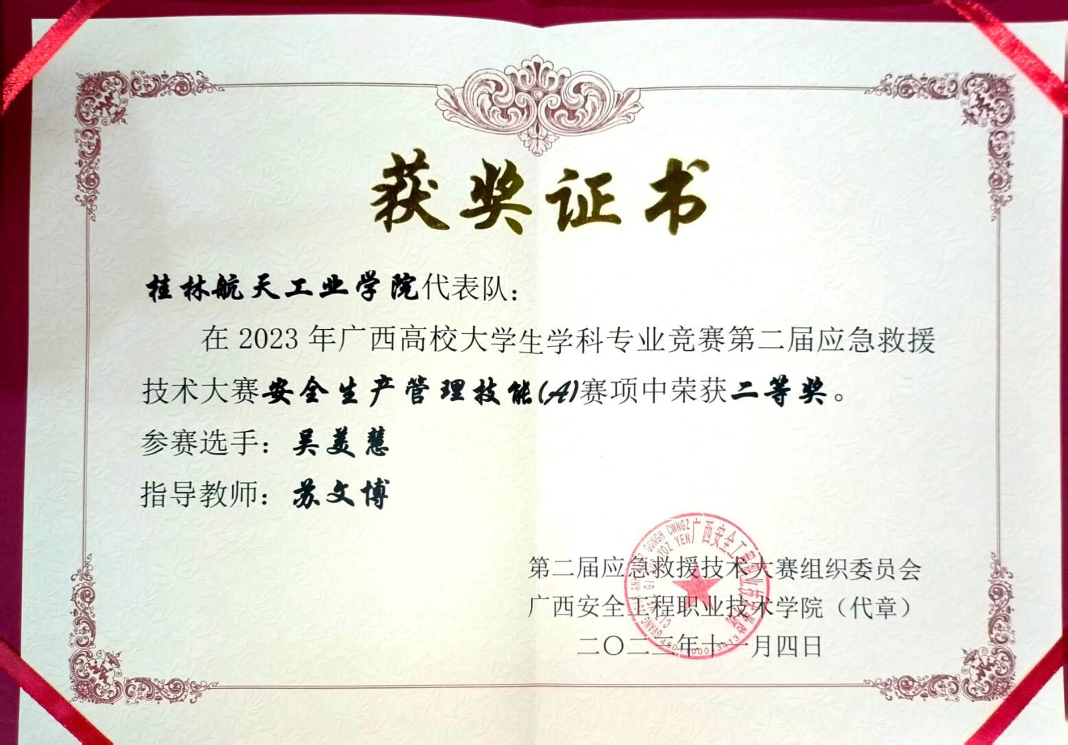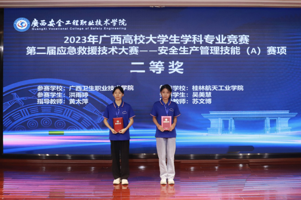 为促进应急救援技术专业的建设与发展,提升应急救援人才的技能与水平,11月2至5日,由广西壮族自治区教育厅指导的2023年广西高校大学生学科专业竞赛第二届应急救援技术大赛在广西安全工程职业技术学院举行。能源与建筑环境学院2022级安全工程专业学生吴美慧在安全生产管理技能(A)赛项表现突出,展现了扎实的专业技能,获得了2023年广西高校大学生学科专业竞赛第二届应急救援技术大赛二等奖。