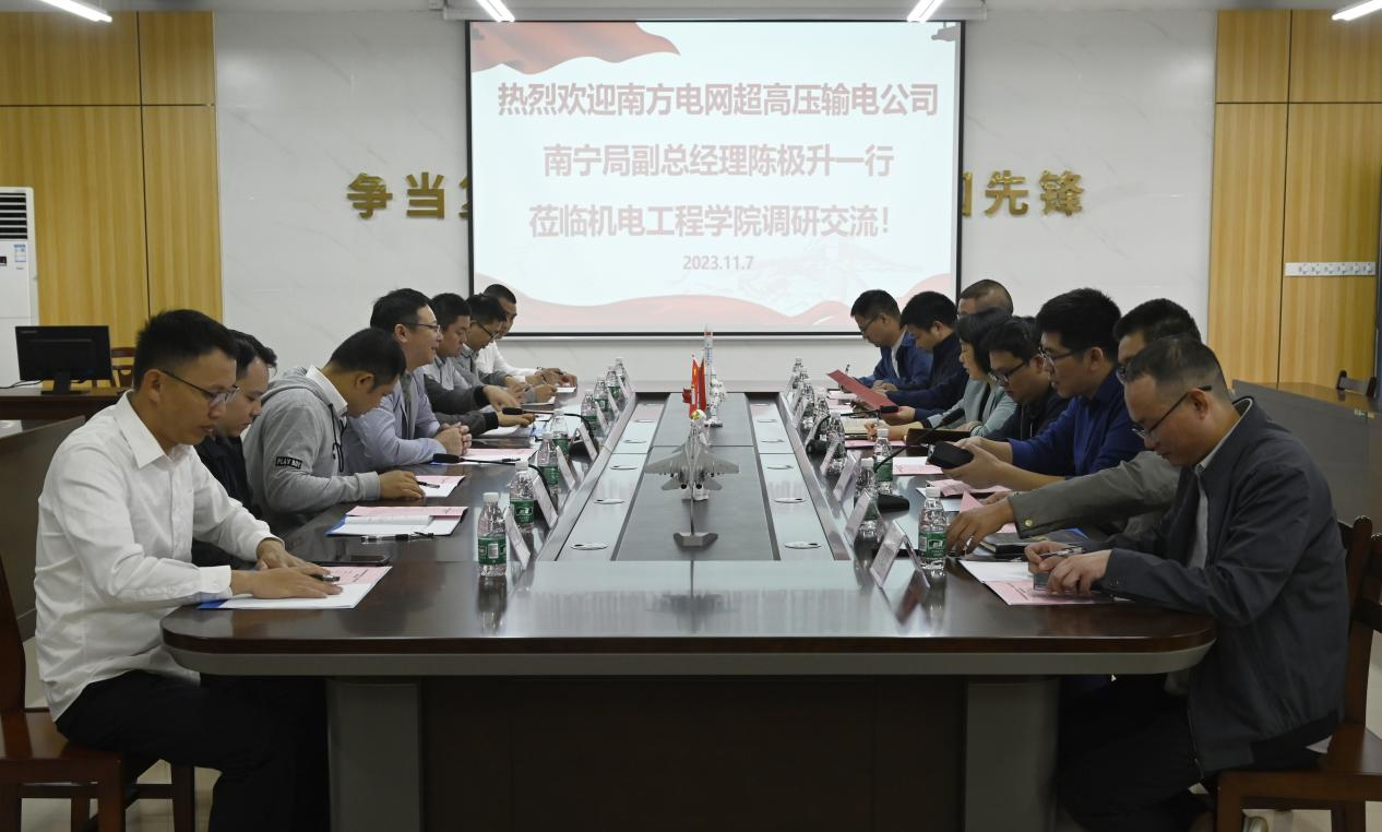 11月7日上午,南方电网超高压输电公司南宁局副总经理陈极升一行8人莅临学校调研交流。学校副校长葛莉、科技处主要负责人、机电工程学院党政领导班子和广西特种工程装备与控制重点实验室负责人、教师代表参加了座谈会,会议由机电工程学院院长韩兴国主持。