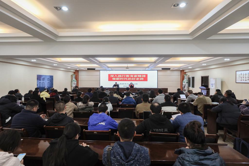王枬从新时代“教育家精神”解读、中国“教育家”的精神画像、新时代大学对教师提出的要求三个方面展开,结合生动的教学实践、教育案例,以“习近平致全国优秀教师代表的信”为引,详细阐述了“教育家精神”的内涵和意义;通过介绍孔子、陶行知、于漪、卫兴华、张桂梅的事迹,让老师们感受了中国著名教育家的情怀与使命。同时,王枬解读了如何践行教育家精神,需要处理好“教书与育人、经师与人师、良师与益友、言传与身教”四对关系,坚持这“四个统一”,才能更有效地投身于教育强国的建设。