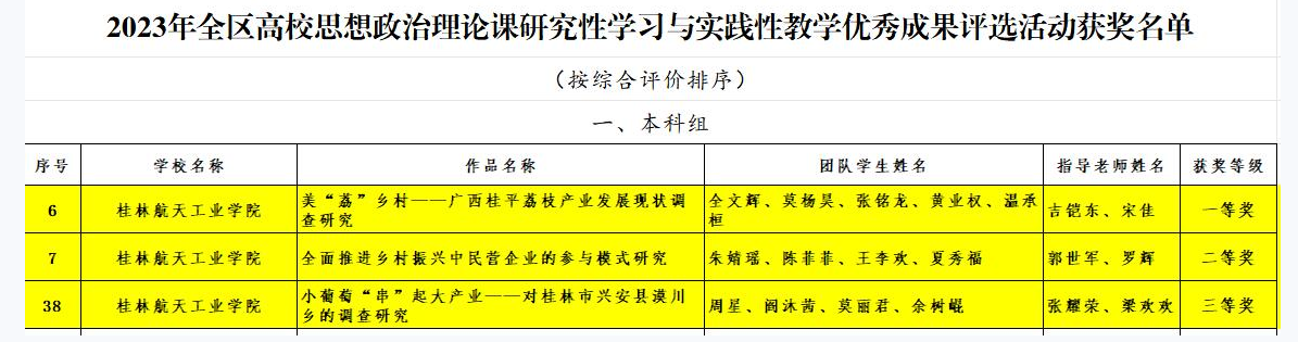 近日,自治区教育厅公布了2023年全区高校思想政治理论课研究性学习与实践性教学优秀成果评选活动的获奖通知。由马克思主义学院教师吉铠东博士、宋佳老师指导,2020级商务英语专业学生全文辉参加的《美“荔”乡村——广西桂平荔枝产业发展现状调查研究》斩获一等奖;由郭世军博士、罗辉老师指导,2021级财务管理专业学生王李欢参加的《全面推进乡村振兴中民营企业的参与模式研究》斩获二等奖。由张耀荣、梁欢欢老师指导,2021级人力资源管理专业学生周星参加的《小葡萄“‘串”起大产业一-对桂林市兴安县漠川乡的调查研究》荣获三等奖。