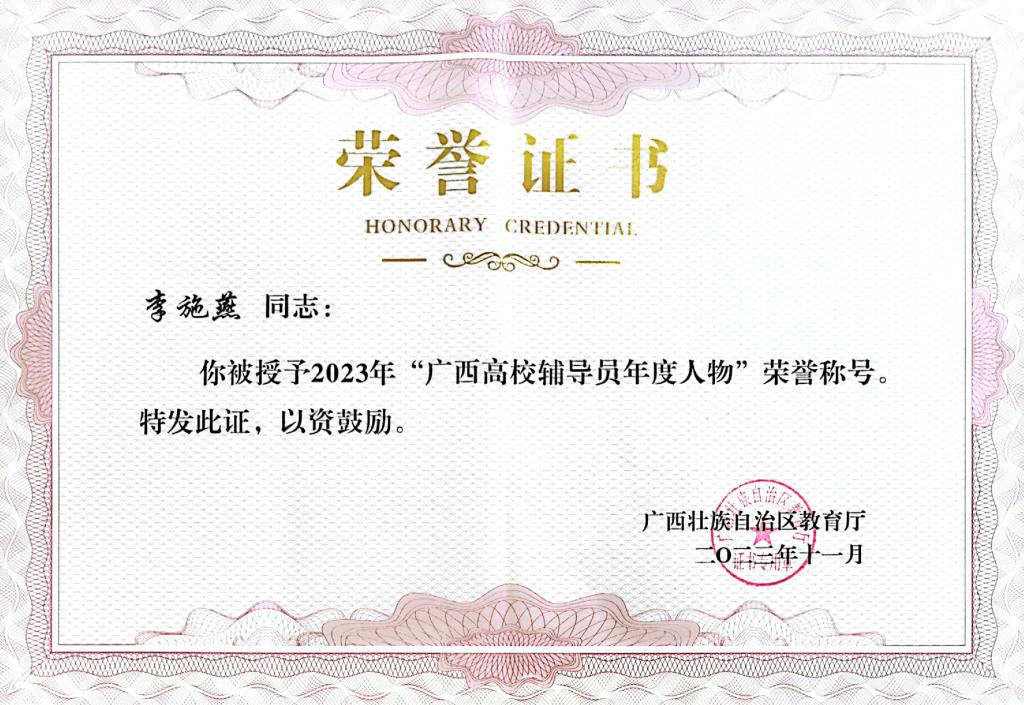 由广西壮族自治区教育厅开展的2023年“广西最美高校辅导员”暨“广西高校辅导员年度人物”推荐展示活动结果揭晓,best365官网理学院辅导员李施燕获“广西高校辅导员年度人物”荣誉称号。