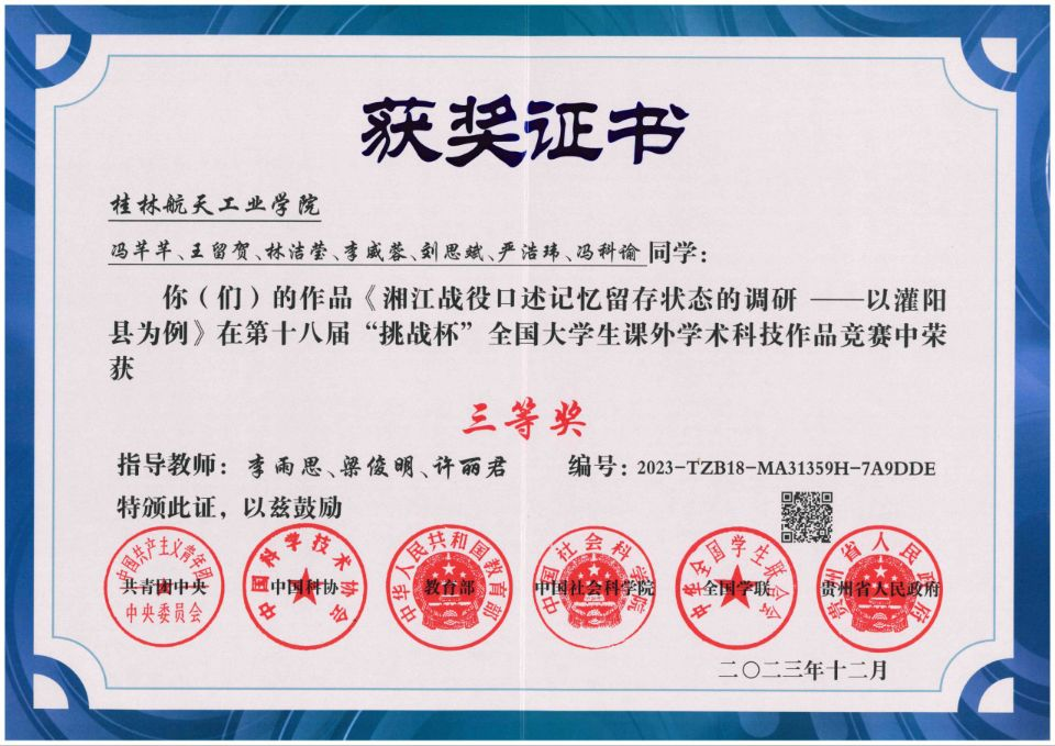 近日,由共青团中央、中国科协、教育部、中国社会科学院、全国学联、贵州省人民政府共同主办的第十八届“挑战杯”全国大学生课外学术科技作品比赛结果正式公布,best365官网再创佳绩,《湘江战役口述记忆留存状态的调研—以灌阳县为例》在第十八届“挑战杯”全国大学生课外学术科技作品竞赛中荣获三等奖。