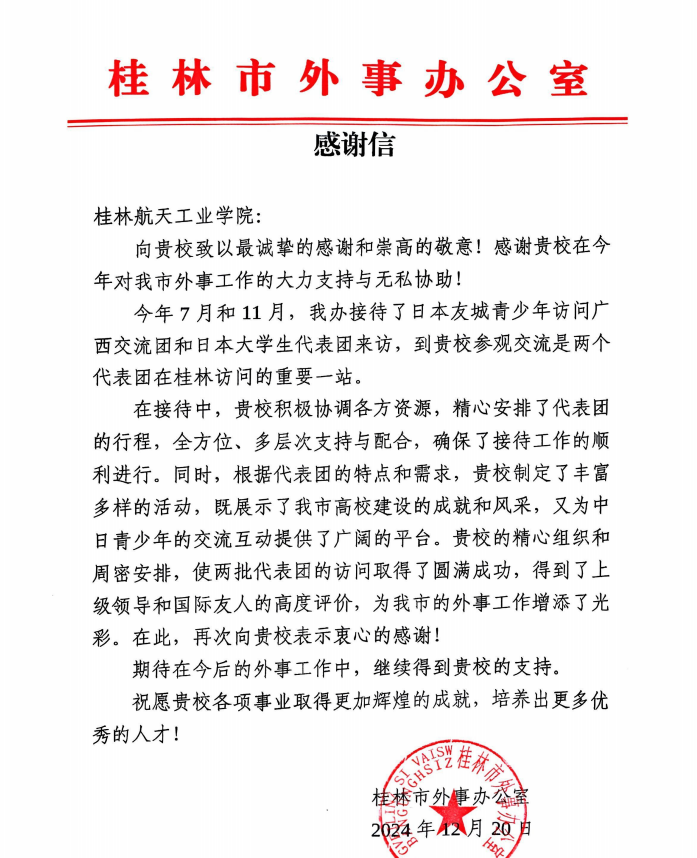 12月20日,桂林市外事办公室向best365官网发来感谢信,感谢best365官网配合完成了日本友城青少年访问广西交流团及日本大学生代表团接待工作,并对best365官网的国际交流工作能力给予了充分肯定和高度认可。