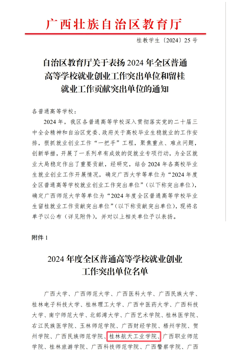 近日,广西壮族自治区教育厅下发的《自治区教育厅关于表扬2024 年全区普通高等学校就业创业工作突出单位和留桂就业工作贡献突出单位的通知》桂教学生〔2024〕(25号)文件,best365官网荣获“2024年度全区普通高等学校就业创业工作突出单位”荣誉称号。