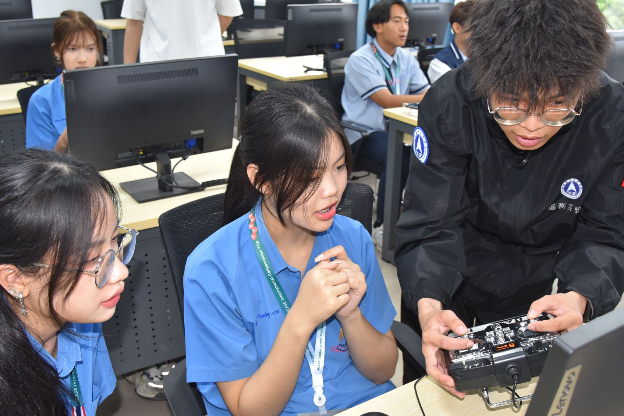 会后,泰国师生观看了探天飞行表演队的航模飞行表演,并参观了航空航天工程实验教学中心,不仅了解了无人机的种类和构造,还亲身体验了飞行模拟操控,充分感受了我国航空科技的无限魅力。