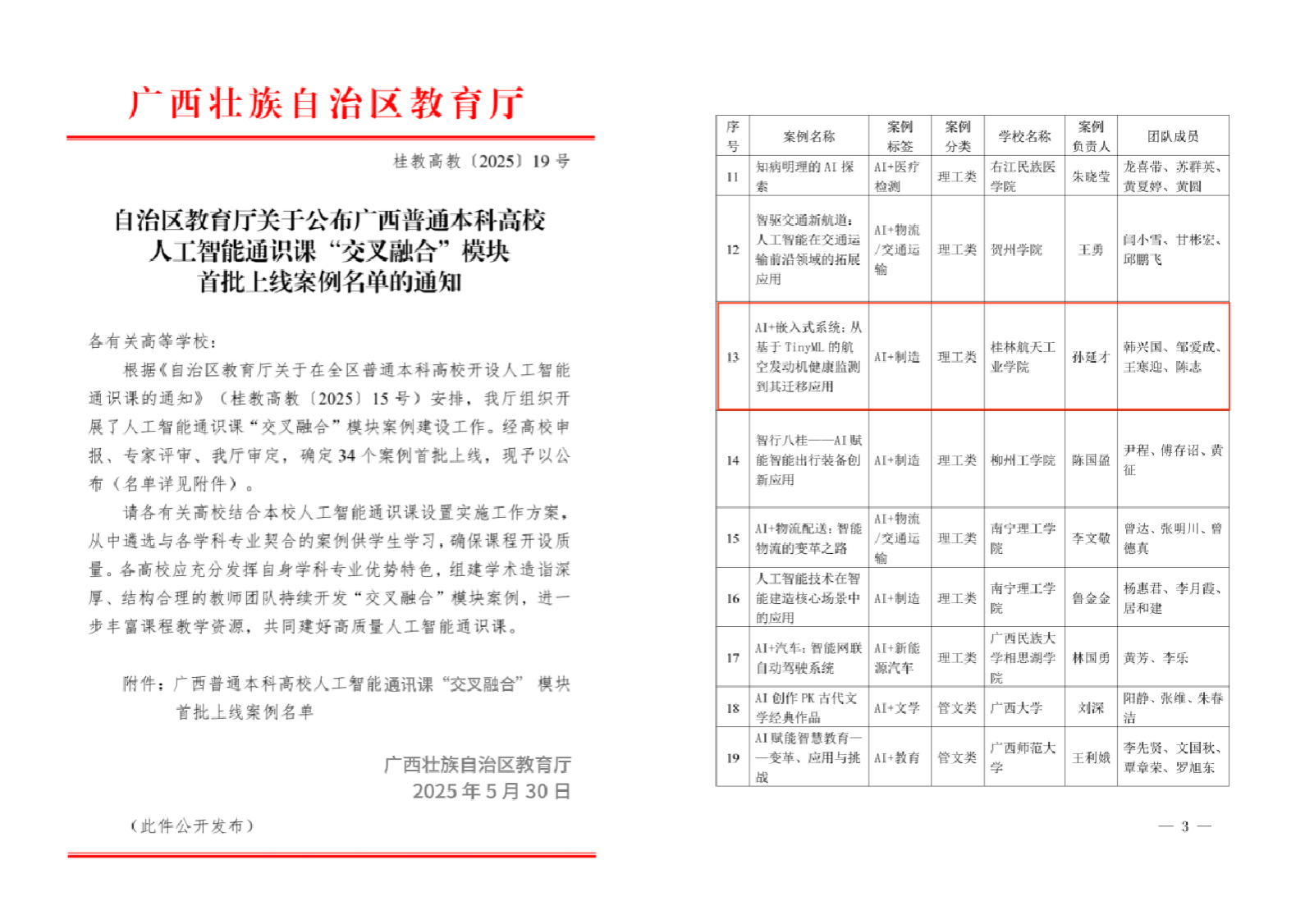 近日,根据《自治区教育厅关于公布广西普通本科高校人工智能通识课”交叉融合”模块首批上线案例名单的通知》,best365官网申报的《AI+嵌入式系统:从基于TinyML的航空发动机健康监测到其迁移应用》案例成功入选首批上线案例名单,本次全区共有34个案例获得认定。