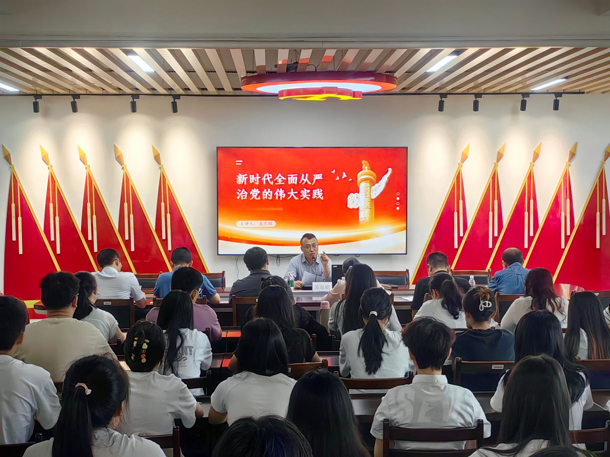 在专题党课中,吴尽昭校长从理论高度和实践维度,系统阐述了全面从严治党的时代内涵。他指出,全面从严治党是新时代党的建设的鲜明主题,是保持党的先进性和纯洁性的必然要求。吴尽昭强调:一要坚持党要管党,把严的要求贯穿党的建设全过程;二要深化标本兼治,构建风清气正的校园政治生态;三要推动全面从严治党向基层延伸,确保党中央决策部署在基层落地生根。他特别指出,高校作为人才培养的重要阵地,必须坚持社会主义办学方向,以全面从严治党新成效引领学校事业高质量发展。