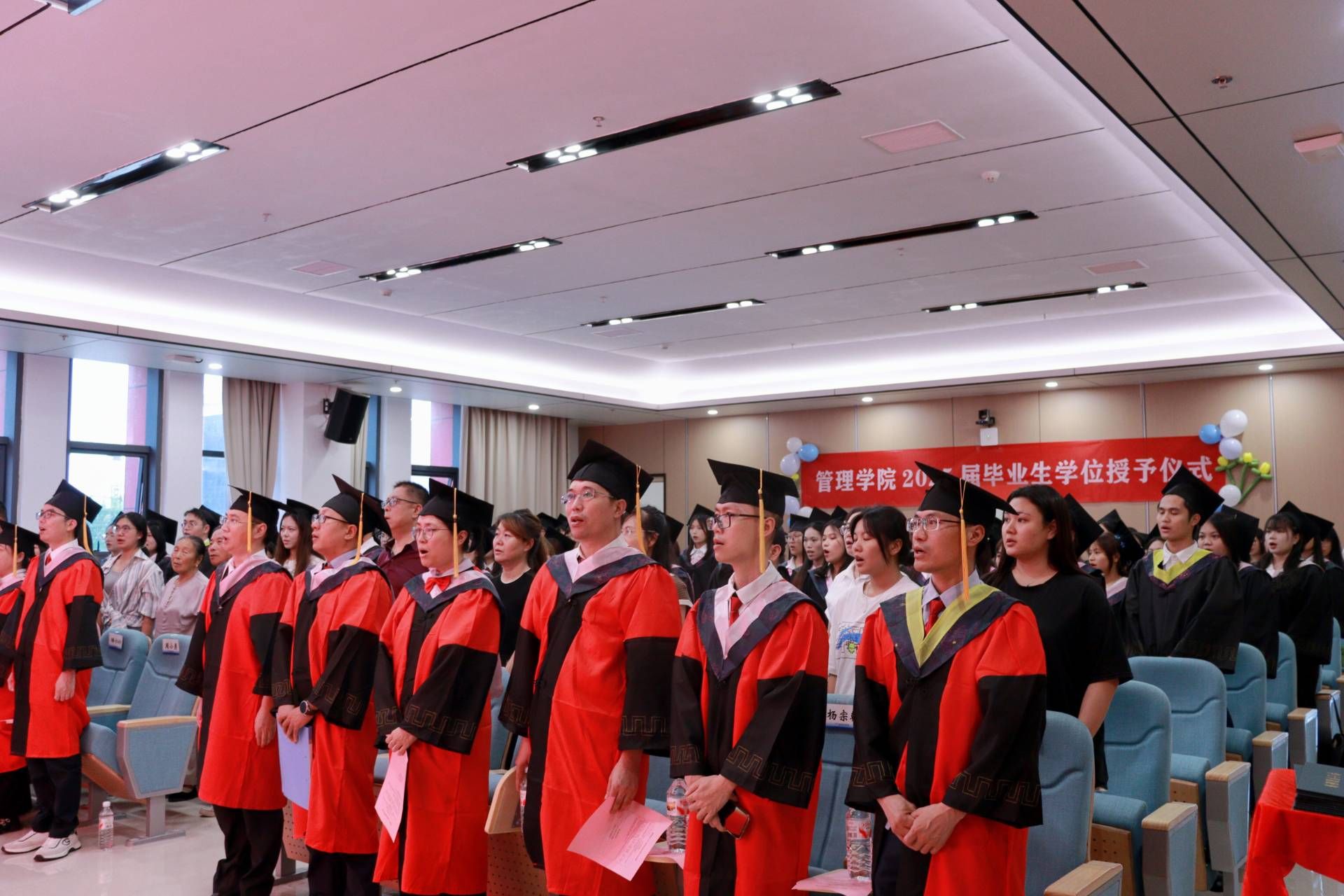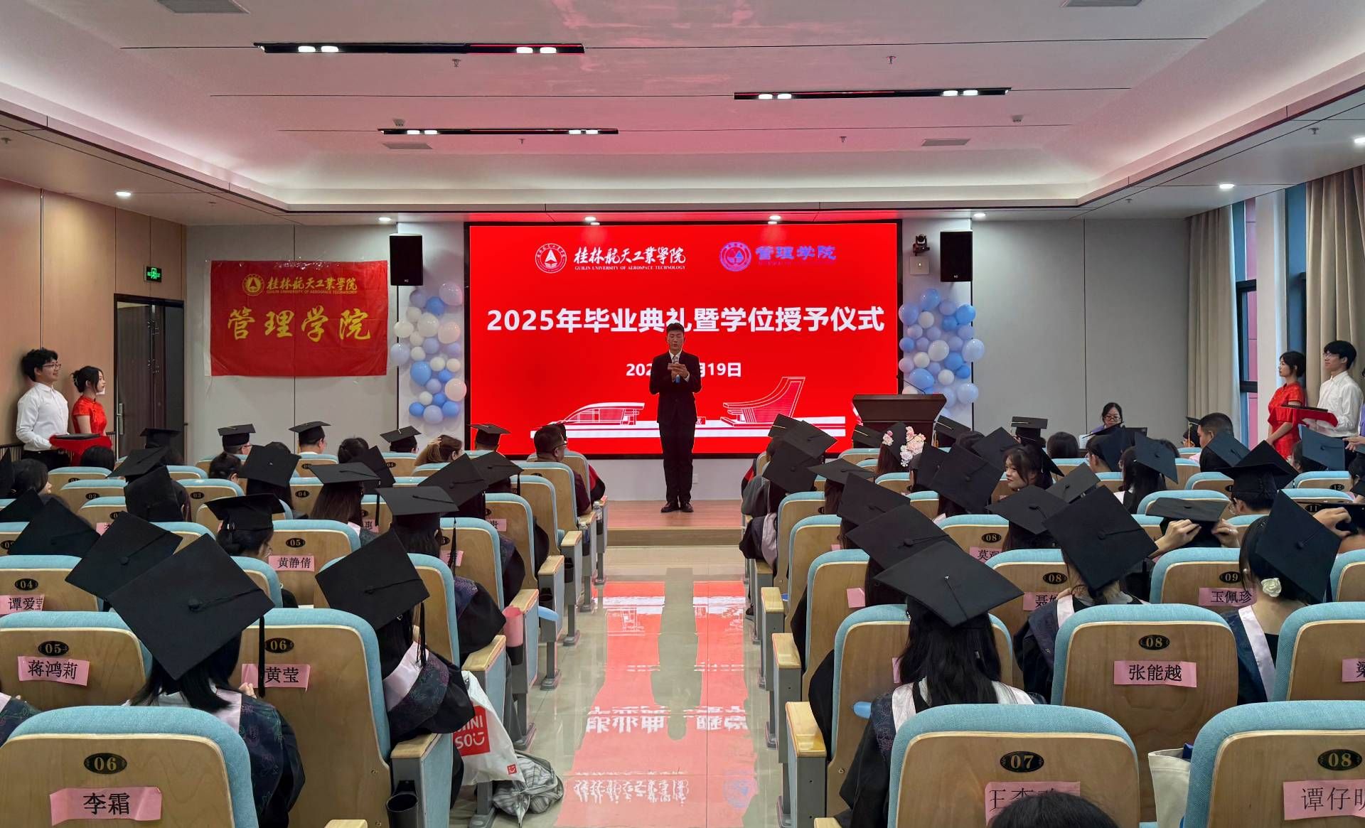 六月的桂航,阳光灿烂,繁花似锦。6月19日,管理学院2025届毕业典礼暨学位授予仪式在南校区问天楼小报告厅隆重举行。学院党委书记尹剑武,院长周小勇,党委副书记潘小玲,副院长阳正义、徐平磊,各教研室主要负责人、毕业班辅导员,满载收获的2025届毕业生及家长代表齐聚一堂,共同见证这一庄严而充满希望的青春盛典。