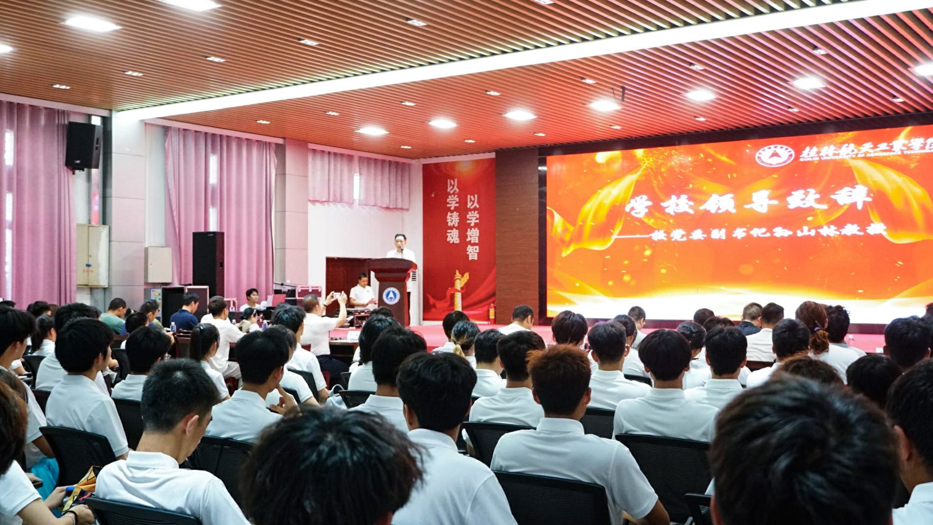 2025年7月3日,广西壮族自治区第十四届学生运动会代表团出征仪式在北校区招聘大厅隆重举行。学校党委副书记、体育运动委员会主任孙山林,学工部(处)、教务处、校团委、体育部及各学院分管学生工作负责人,全体代表队教练员、运动员参加活动。