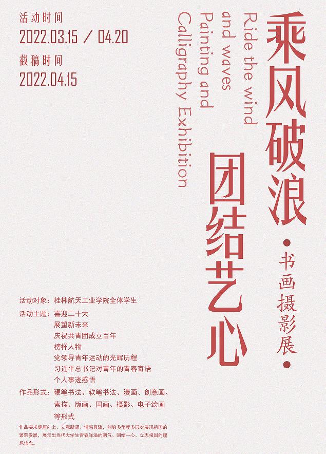 根据”乘风破浪 团结艺心”为绘画主题,围绕团史、榜样人物、党领导青年运动的光辉历程、习近平总书记对青年的青春寄语、青年团员如何向党靠拢、个人事迹感悟等进行创作,展现中国共青团在党的领导下茁壮成长,展现祖国和家乡日新月异的变化。作品要求健康向上、立意新颖、情感真挚,能够多角度多层次展现祖国的繁荣发展,展示出当代大学生青春洋溢的朝气、团结一心、立志报国的理想信念。