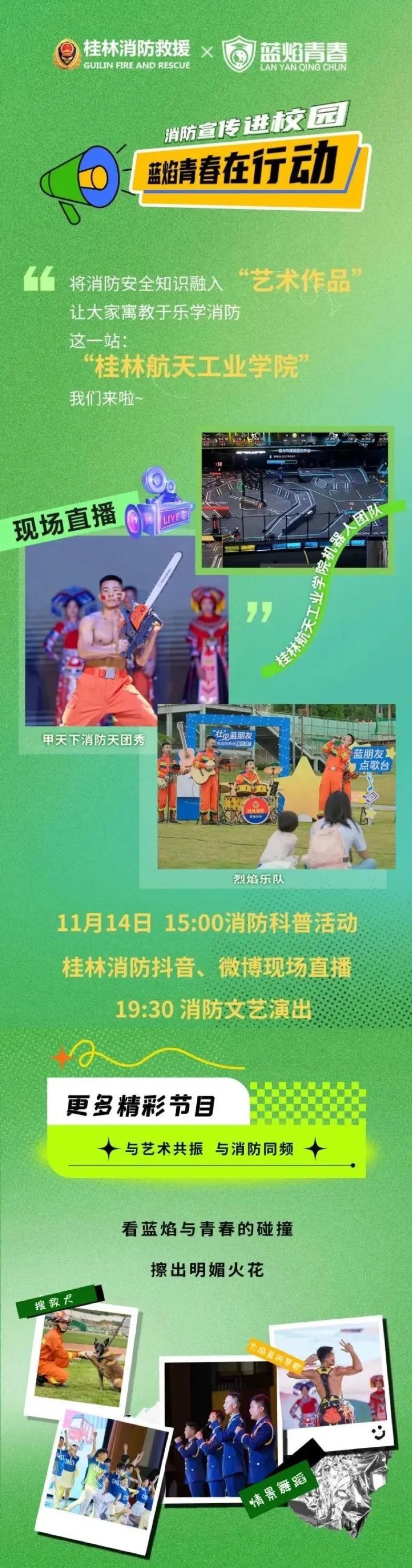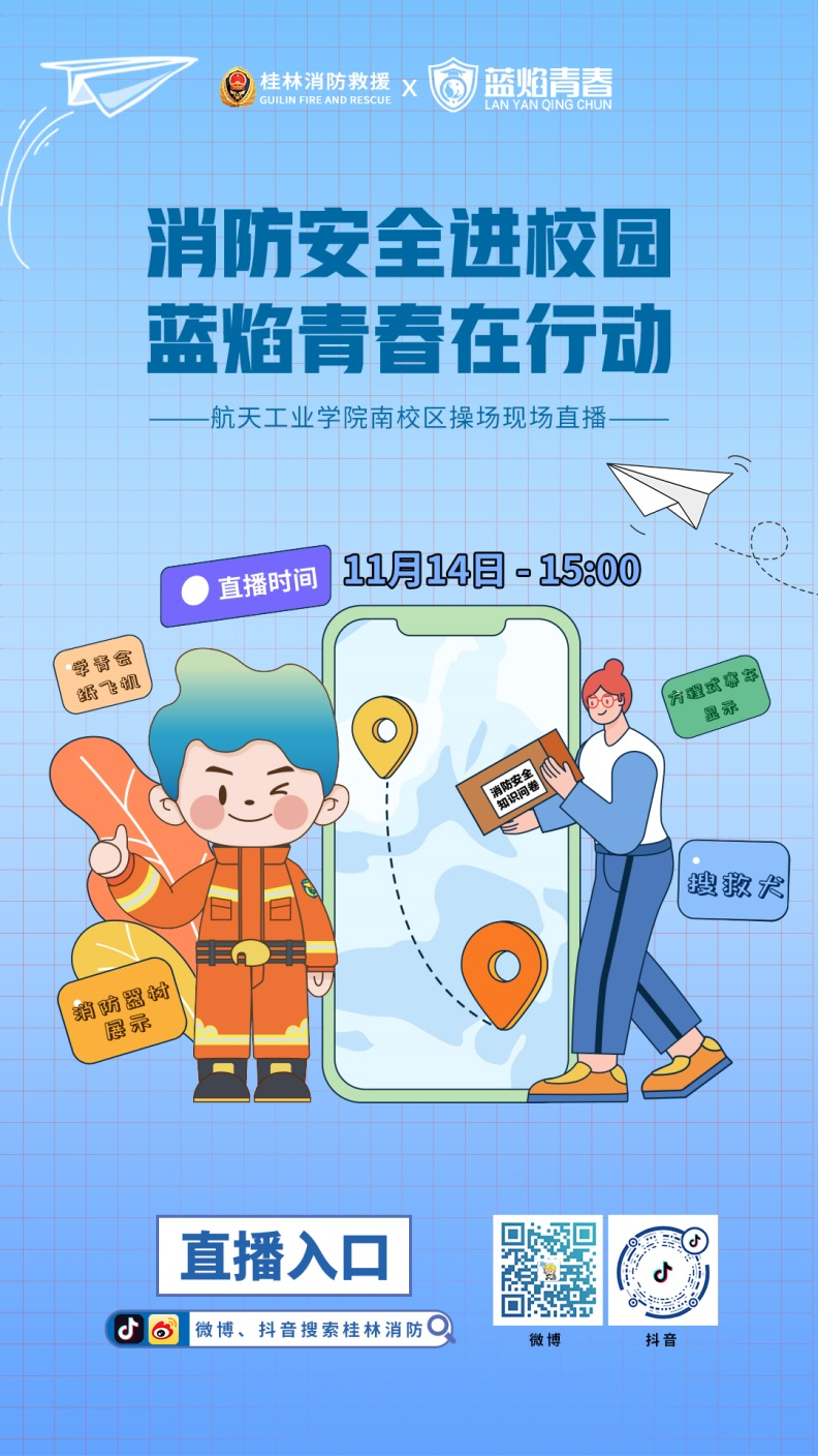 活动由桂林消防抖音号及微信视频号进行现场直播,敬请搜索“桂林消防”并关注,也可扫描下方海报二维码进入直播入口。
